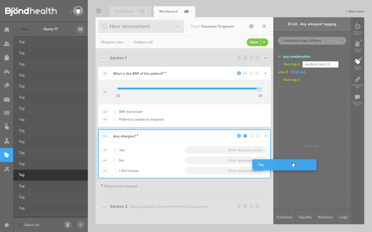 - the tagging logic, where an answer adds tags to the patient, the medical condition, the treatment, etc.